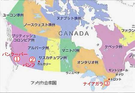 | 成田04.8.18 ⇒[8.5H空路]⇒ ①バンクーバー 8.18 ⇒[2.5H空路]⇒ カルガリー空港 ⇒[2H車]⇒ ② バンフ(カナディアン ロッキー)8.19~8.21 ⇒[2H車]⇒ カルガリー空港 ⇒[2H空路]⇒ トロント空港 ⇒[2H車]⇒ ③ナイアガラの滝 8.22~8.23 ⇒[2H車]⇒ トロント空港 ⇒[13.5H空路]⇒ 成田8.25 |