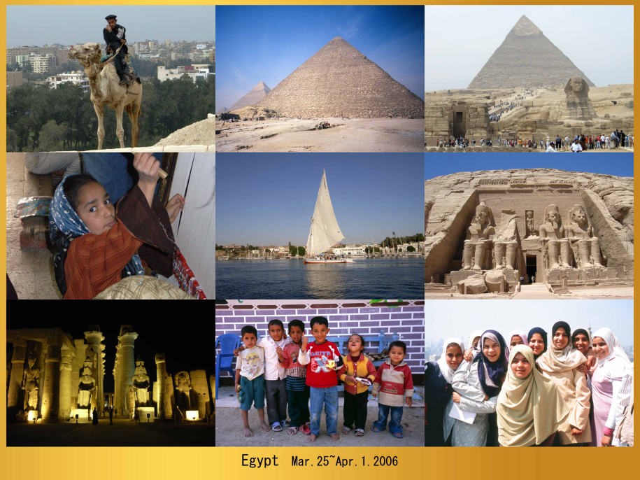 エジプトの人口は約7000万人、面積は日本の約2.6倍である。古代より6700Km(世界最長)にも及ぶナイル河の恩恵に浴する農業国で国土の95%は砂漠地帯だが豊かな水資源に恵まれ国民の30~40%が農業に従事している。石油、天然ガスも産出し、綿花の輸出、スエズ運河通行料、観光業、出稼ぎ者からの送金などで外貨を獲得し近代化を急いでいる。カイロ市内を流れるナイル河の水は美しく、環境への配慮も成されている。ピラミッドなどの観光地は欧米人の観光客でごった返し、それを狙ったテロへの警戒が厳しく、いたる所に黒い制服で銃を背負った警官が暑そうに立っていた。今は未だ冬服の時期で衣替えしていないのだそうだ。差し迫った緊張感は無かったが、間近に見るカラシニコフ銃は不気味である。幹線道路には車が溢れているが、交差点のない構造になっていて信号機が無いので渋滞は少ない。信号機があっても守らないらしいのだが、横断歩道は無く、車一台当たりの交通事故の死亡率は日本の17倍とか、…なので旅行者が広い車道を横断するのは危険で止めた方が良い。イスラム教国にしてはモスク(イスラム礼拝堂)の数が少ない様に見える。町にはホームレスや物乞いが全くいない。華やかに着飾った地元女性もいないので貧富の差は感じないが、総じて豊かさやノンビリした雰囲気はなく、懸命に明日の糧を得ようと必死で努力している様子だ。市場や空港以外の土産店には女性の売り子がほとんどいない、アラブ系で強面の男性ばかりがやたら沢山いて、窓の女性にカメラを向けると怒り出すこともあった。しかし若い女性は総じて陽気で喜んでポーズに応じてくれた。日本でうっかり女性にカメラを向けたりすれば「お巡りさーん」もありうるので文化の違いだろう。一番困ったのはトイレのチップで毎回50ピアストル(9円)~1エジプトポンド(18円)を支払わなければならない、金額は少ないのだが少額紙幣へ両替が困難で何時も心配ばかりしていた。だがトイレは清潔でタオルのサービスがあったりしてワークシュアリングがなされいる。親指と人差し指をこするのがチップ請求のポーズで、エジプト人の男性にカメラを向けたりすると要求されることがあるが、1エジプトポンド渡せば安心して撮せるのでモデル料と考えれば良い。エジプト料理は牛肉が主で、さしたる特徴もなかった。成田カイロ間で利用したエジプト航空は日本人の乗務員がいて言葉の心配がなく安心できた。しかし宗教上の理由でアルコール類は全く出ない、持ち込みはOKなのだが冷えたビールが飲めないのは残念…。エジプトは完全に観光地化されていて、パンフレットにある様な見渡す限りに広がる砂漠の中に、こつ然とそびえる幻想的なピラミッドのイメージとは全くかけ離れている。しかし、7000年の歴史を誇る文明発祥の国、そのスケール大きさを片道14時間で目の当たりに出来るので一度は訪れて見たい国である。渡航日06.3.25~4.1 8日間 |